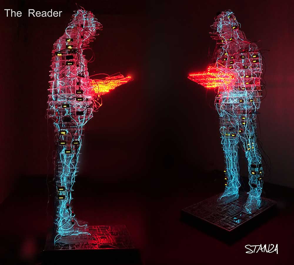 The Reader is a large six foot data visualization sculpture of the artist Stanza wearing a hoodie reading a book. The sculpture becomes a pulsing algorithmic heartbeat of living data. It is made with custom made digital software and hardware generating live events inside the sculpture. The Reader is a machine for the systems age. The Reader is a data visualisation sculpture about artificial intelligence and machine learning. Data is taking over our bodies and making its very own nervous system. The artwork uses open data and new technologies to question audiences’ experiences of real-time events. We live in a world of infobesity, we are bombarded with information that is made malleable inside the artwork, it is shaped to give it meaning. The data body acts to reposition a future view of ourselves when embedded technologies will become part of our everyday lives. In the future there will be different varieties of man and machine all embedded with different levels of technology and therefore experience and knowledge.