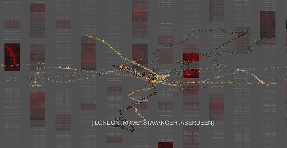 This is a piece of software that allows anyone participating to be tracked and visualised and become part of the artwork. Volunteers can be anywhere from 10 to 1000 or more people can can part of the artwork at once. The Global Derive, is a newly created artistic artwork engaging with issues of data ownership, privacy of information within the real time city.