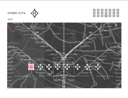 The city codes itself up into a growing patterns and images based on algorithmic patterns. The digital city experience. The 'central city' has become an amalgamation of images from art, architecture, design and urbanism.