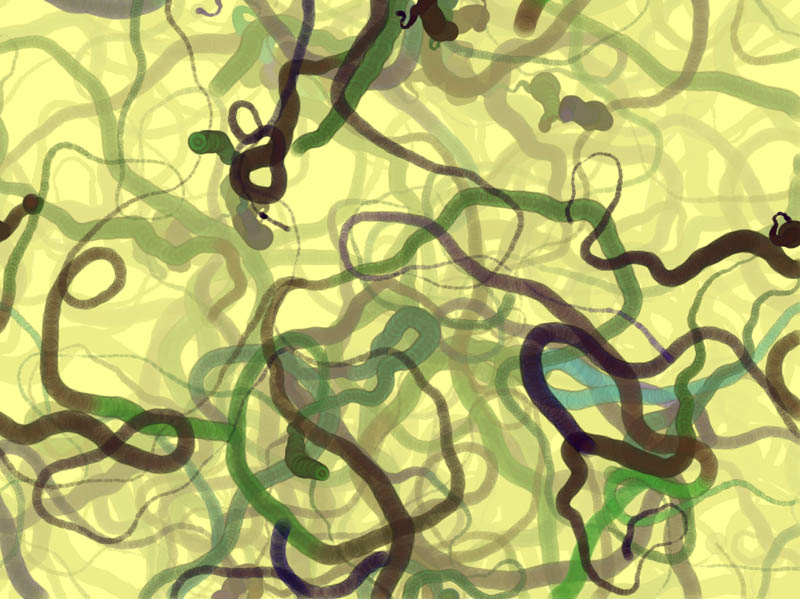 These artifacts range from organic to mechanistic. Each is abled to randomly branch, and some die and fade over time. Touching the screen enables newer branches to occur although this might not be evident. These are the online version click to enter above, or see screenshots below.