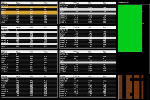 MoteProxy Software Also developed is the online custom built software software to collect environmental data from the sensors allowing the data to be ported over networks to the Sonicity software. This Moteproxy software is a java middle-ware environment for connecting up xbow motes allowing access to the data outside and directly off the motes. It is now in version two and sits on its own server. It allows access to the two networks of twenty motes in real time from which PHP and XML pages are served up. Moteproxy allows real time polling of data online from any sensors network that is connected and switched on, the data is then formatting in PHP and XML to enable anyone to make a visualization or interpretation of the data with it. The changing data is what affects what you see and experience. The sensors monitor temperature, sounds, noise, light, vibration, humidity, and GPS