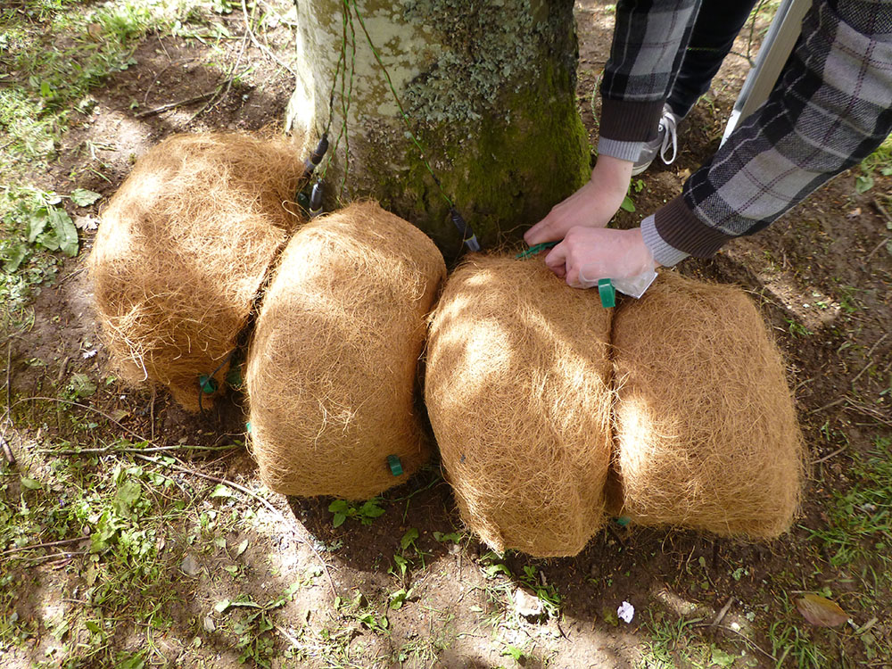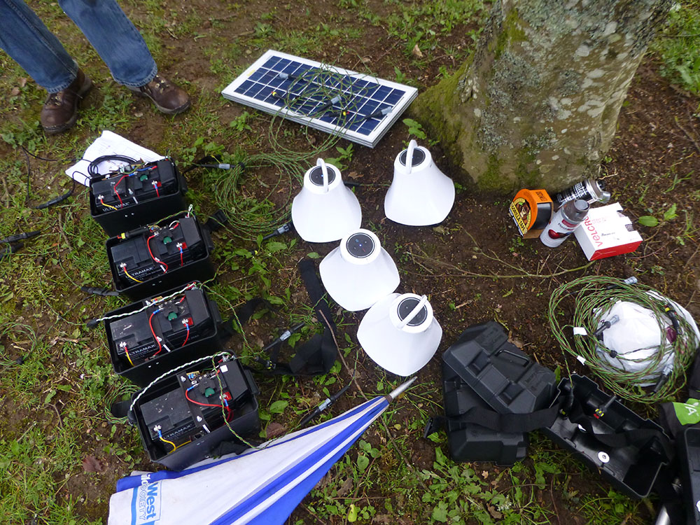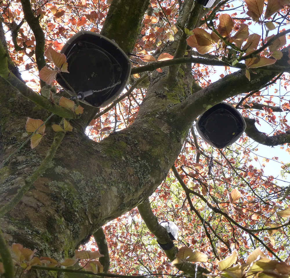 A custom made wireless speaker system powered by batteries and solar panels presents the sounds. The speakers are placed on the tree/s. The noise level will be set not be just above an ambient level this will not be a loud installation. However one should be able to hear it. The speakers they will be attached to meet all health and safety concerns |